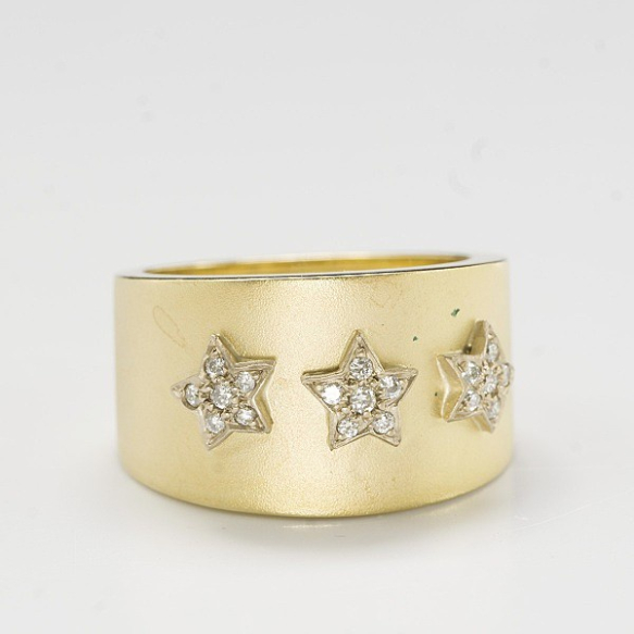 ANEL LARGO EM OURO AMARELO FÔSCO 18K COM ESTRELAS CRAVEJADAS 18 BRILHANTES FULL CUT DE APROX 0,19 PONTOS TOTAL.PESO 8 GRAMAS ARO 16,5.