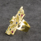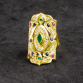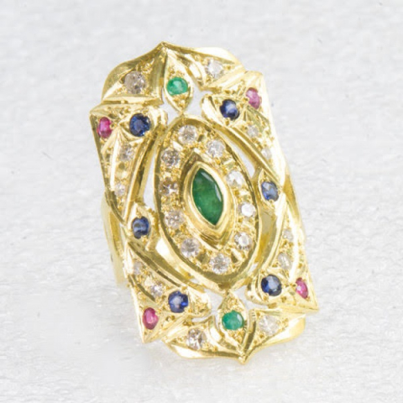 RICO ANEL EM OURO AMARELO 18K COM UMA NAVETE DE ESMERALDA,DUAS ESMERALDAS MENORES, SEIS SAFIRAS AZUIS, QUATRO RUBIS E 22 BRILHANTES FULL CUT E 8X8 DE APROX 0,44 PONTOS TOTAL.PESO 14,9 GRAMAS ARO 18.BASE MEDINDO 3,4CM X 2CM.