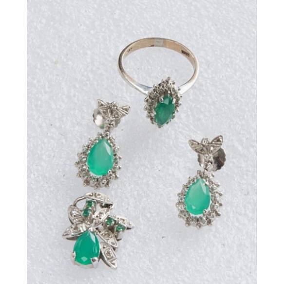 CONJUNTO EM OURO BRANCO 18K COMPOSTO POR ANEL,PAR DE BRINCOS E PINGENTE,PESO TOTAL 13,9 GRAMAS.PAR DE BRINCOS EM OURO BRANCO 18K COM DUAS PEDRAS VERDES E 34 PEDRAS BRANCAS.PESO 6,7 GRAMAS MEDINDO 2,1CM X 1CM.ANEL EM OURO BRANCO 18K CONTRASTADO COM PEDRA VERDE E 14 PEDRAS BRANCAS.