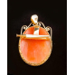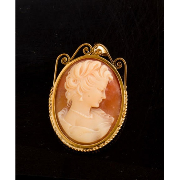 PINGENTE BROCHE EM OURO 14K COM CAMAFEU DE CONCHA.PESO 8,3 GRAMAS MEDINDO 4CM X 2,6CM.