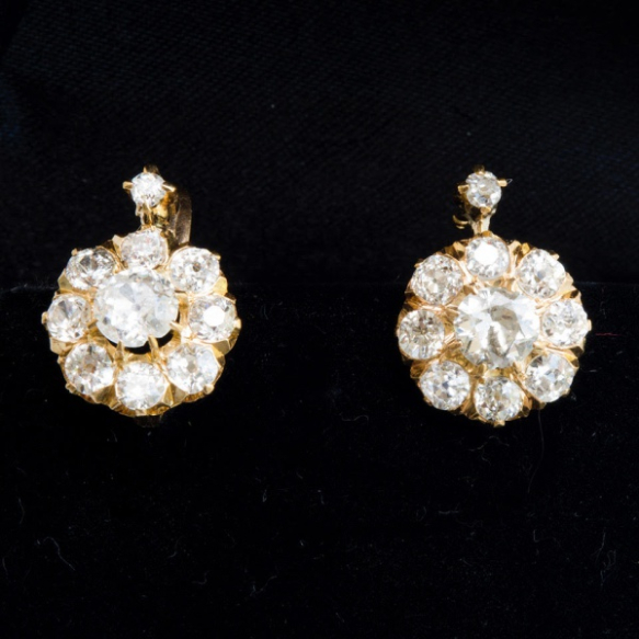 RARO E DE GRANDE QUALIDADE .PAR DE BRINCOS CIRCA 1880 EM OURO 14K COM APROX 2,76 QUILATES TOTAL DE DIAMANTES(DOIS DIAMANTES CUSHION CUT DE APROX 1 QUILATE TOTAL + 16 DIAMANTES DE APROX 1,76 QUILATES TOTAL+ DOIS DIAMANTES MENORES).PESO 4,1 GRAMAS MEDINDO 1,5CM X 1,2CM.