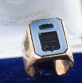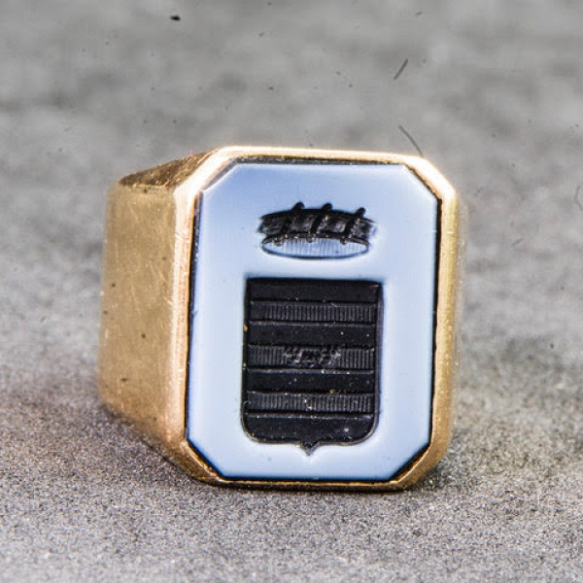ANEL CARIMBO BRASÃO DE FAMÍLIA COM ÁGATA GRAVADA EM OURO 18K. PESO 10,7 GRAMAS ARO 14.BASE MEDE 1,6 X 1,2CM.