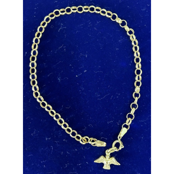 DELICADA PULSEIRA DE ELOS PORTUGUÊSES COM PINGENTE ESPÍRITO SANTO EM OURO AMARELO 18K CONTRASTADOS.PESO 2,1 GRAMAS.PULSEIRA MEDINDO 18CM ABERTA E O PINGENTE 0,8CM X 1CM.