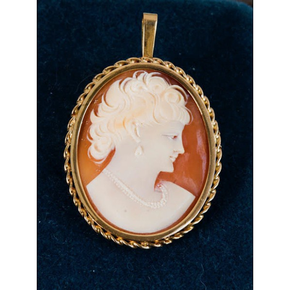 PINGENTE BROCHE CAMAFEU DE CONCHA EM OURO ROSÊ 14K.PESO 6,5 GRAMAS MEDINDO 4 X 2,5CM.