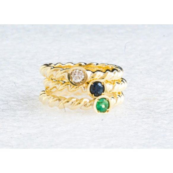 CONJUNTO DE TRÊS ANÉIS MACIÇOS INDEPENDENTES. EM OURO AMARELO 18K COM UM BRILHANTE FULL CUT DE APROX 0,15 PONTOS,UMA ESMERALDA DE APROX 0,15 PONTOS E UMA SAFIRA AZUL DE APROX 0,20 PONTOS.PESO TOTAL 14 GRAMAS AROS 16 E DOIS 16,5.