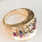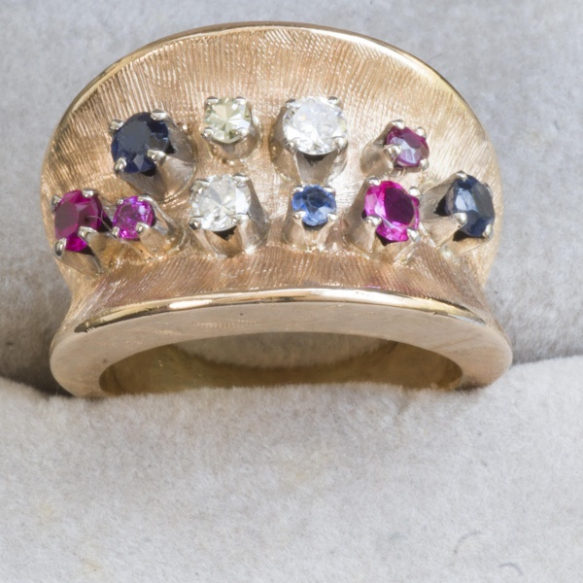 ANEL LARGO ANOS 50 EM OURO ROSÊ 18K COM DOIS BRILHANTES DE APROX 0,27 PONTOS TOTAL + PEDRAS AZUIS E VERMELHAS.PESO 10,9 GRAMAS ARO 14.