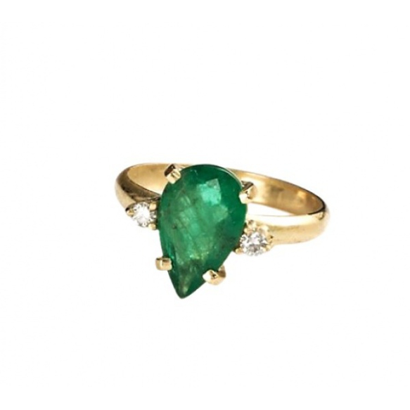 ANEL EM OURO AMARELO 18K COM ESMERALDA EM GOTA DE APROX 2 QUILATES E DOIS BRILHANTES DE APROX 0,09 PONTOS TOTAL. PESO 3.8 GRAMAS ARO 18.BASE MEDE 1,8 X 0,8CM.
