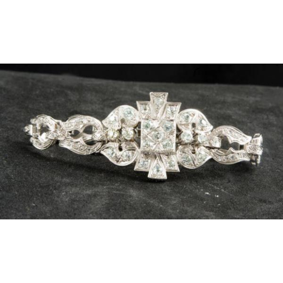RARA PULSEIRA ART DÉCO COM TONALIDADE DE COR DELICADA DE DIAMANTES AZUIS E ESVERDEADOS.EM PLATINA COM APROX 2,98 QUILATES TOTAL DE DIAMANTES (NOVE DIAMANTES VERDES NATURAIS MAIORES DE APROX 1,40 QUILATES TOTAL+ 14 DIAMANTES VERDES NATURAIS MENORES DE APROX 0,80 PONTOS TOTAL+ 78 DIAMANTES ROSE CUT DE APROX 1 QUILATE TOTAL).PESO 36,1 GRAMAS MEDINDO 19,7CM ABERTA X 3CM X 0,7CM.