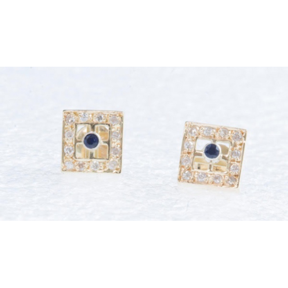 PAR DE BRINCOS EM OURO AMARELO 18K,24 BRILHANTES 8X8 DE APROX 0,24 PONTOS TOTAL E DUAS PEDRAS AZUIS.PESO 3,4 GRAMAS MEDINDO 0,9CM X 0,9CM.