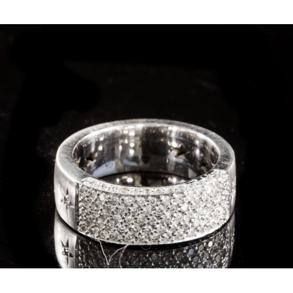 EspañolANEL EM OURO BRANCO FÔSCO18K COM PAVÊ DE 94 BRILHANTES FULL CUT DE APROX 0,94 PONTOS TOTAL COM ESTRELAS INTERNA VAZADAS E DUAS ESTRELAS LATERAIS COM BRILHANTES. PESO 8,8 GRAMAS ARO 16