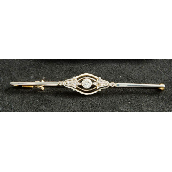 EspañolBROCHE BARRETE ART DÉCO ENGARCE MILLE GRAIN, EM OURO 18K E PLATINA COM UM DIAMANTE OLD EUROPEAN CUT DE APROX 0,20 PONTOS + OITO DIAMANTES ROSE CUT E DETALHE CLARO NAS BORDAS.PESO 3,9 GRAMAS MEDINDO 6CM DE COMPRIMENTO