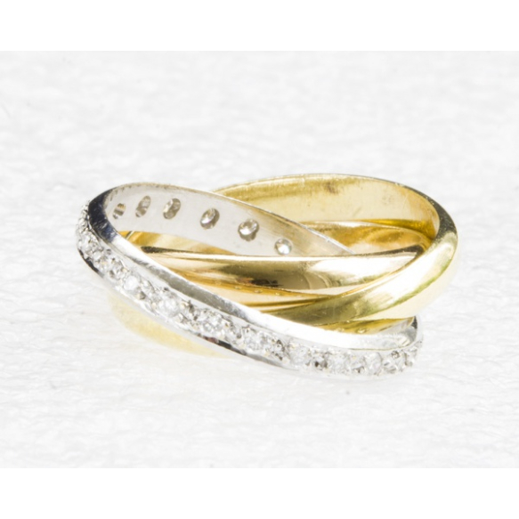 EspañolANEL TRÊS AROS EM OURO AMARELO E BRANCO 18K COM 24 BRILHANTES FULL CUT DE APROX 0,36 PONTOS TOTAL.PESO 7,8 GRAMAS ARO 17.