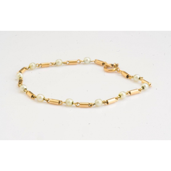 EspañolDELICADA PULSEIRA EM OURO 14K E PÉROLAS.PESO 2,3 GRAMAS MEDINDO 15CM ABERTA.