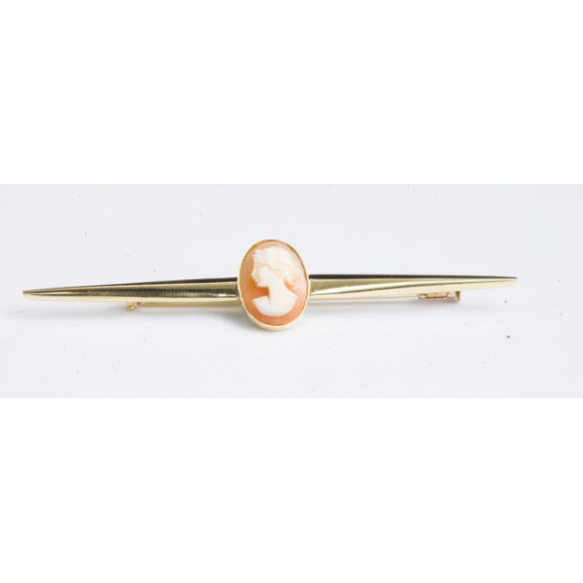 EspañolBROCHE BARRETE EM OURO 18K COM CAMAFEU DE CONCHA.PESO 7,1 GRAMAS.MEDIDA TOTAL 7,3CM DE COMPRIMENTO.SÓ O CAMAFEU MEDE 1,4CM X 1CM