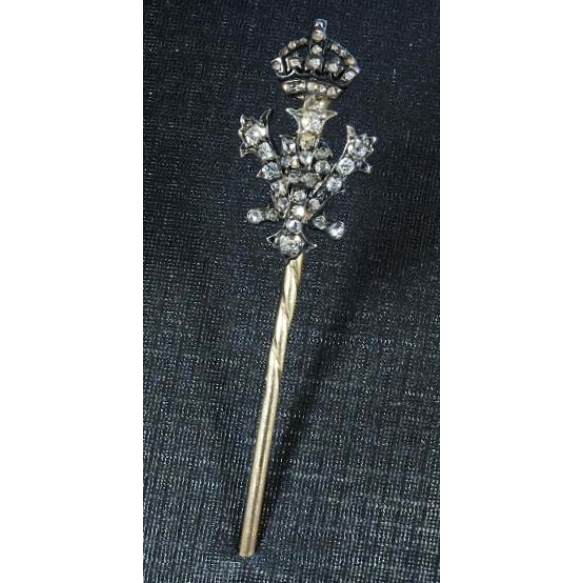 EspañolRARO ALFINETE VITORIANO DO REGIMENTO INGLÊS CERCA DE 1870 COMV DA RAINHA VITÓRIA E ESTRELA. EM OURO 14K E PRATA COM 39 DIAMANTES ROSE CUT. PESO 2 GRAMAS MEDINDO 2 X 1CM O DETALHE COM DIAMANTES