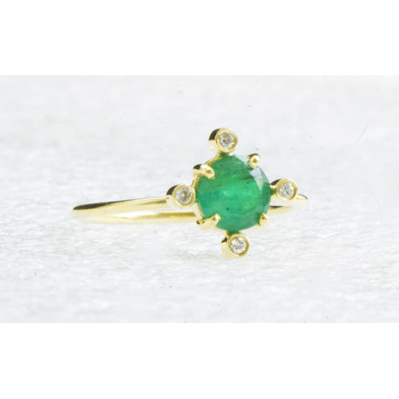 EspañolANEL EM OURO AMARELO 18K COM ESMERALDA DE APROX 0,74 PONTOS E QUATRO BRILHANTES FUL CUT.PESO 1,7 GRAMAS ARO 17.BASE MEDE 1CM X 1CM.