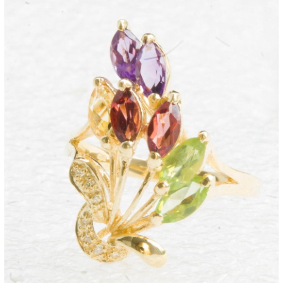 EspañolANEL AMERICANO EM OURO 14K CONTRASTE 585 COM SETE BRILHANTES FULL CUT,PERIDOTOS,AMETISTAS E RUBILITAS .PESO 3,3 GRAMAS ARO 17.BASE MEDE 2,2CM X 1,4CM .