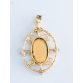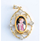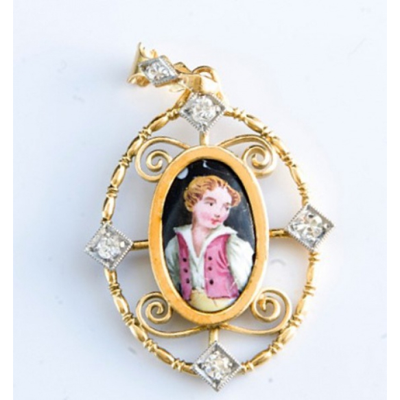 EspañolOBRA DE ARTE.PINGENTE COM PINTURA SUIÇA EM PORCELANA NO CENTRO, EM OURO AMARELO 18K COM CINCO DIAMANTES ENGARCE MILLE GRAIN DE APROX 0,15 PONTOS TOTAL.PESO 2,2 GRAMAS MEDINDO 3CM X 1,6CM.