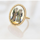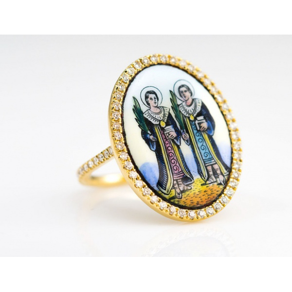 EspañolREFINADO ANEL EM OURO 18K CONTRASTADO REPRESENTANDO SÃO COSME E DAMIÂO . BASE REALIZADA COM ESMALTE PINTADO POR FREIRAS NA SUIÇA NO SEC XX . ARMAÇÃO REALIZADA RECENTEMENTE POR MESTRE JOALHEIRO COM 66 BRILHANTES EM VOLTA E NO ARO DE APROX 1,32 QUILATES TOTAL. ARO 19,5 PESO 7.2 GRAMAS.