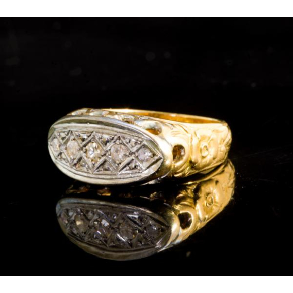 EspañolANEL CIRCA 1920 EM OURO 18K E PLATINA COM CINCO BRILHANTES FULL CUT DE APROX 0,15 PONTOS TOTAL.PESO 8,6 GRAMAS ARO 21.BASE MEDE 2 X 0,9CM.Sinais de uso nas pedras