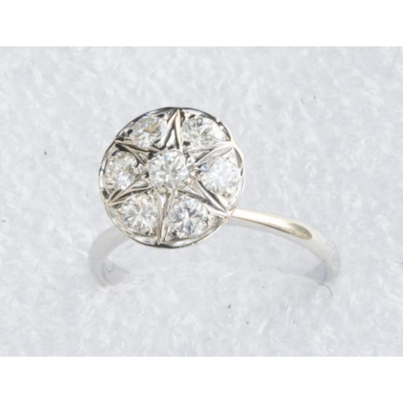 EspañolANEL CHUVEIRO DIFERENTE FORMANDO UMA ESTRELA NO CENTRO. EM OURO 18K COM SETE BRILHANTES FULL CUT DE APROX 0,49 PONTOS TOTAL COR "H I "PUREZA "VS" .PESO 2,9 GRAMAS ARO 18,5.BASE MEDE 1,2CM DE DIÂMETRO .