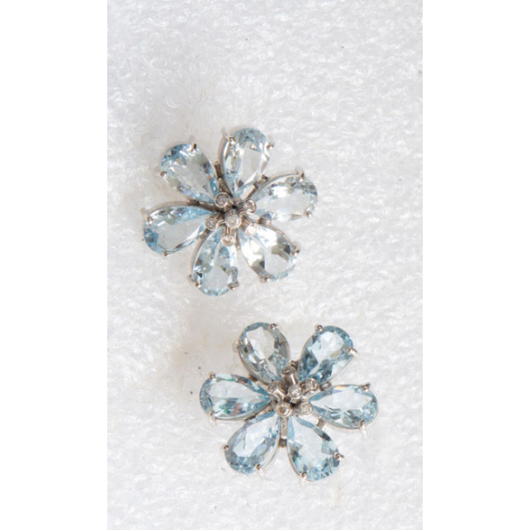 EspañolBELO PAR DE BRINCOS EM OURO BRANCO 18K COM DOZE GOTAS DE ÁGUAS MARINHAS DE 8,07 QUILATES TOTAL E DOZE BRILHANTES DE APROX 0,12 PONTOS TOTAL.PESO 7,7 GRAMAS MEDINDO 2CM DE DIÂMETRO.