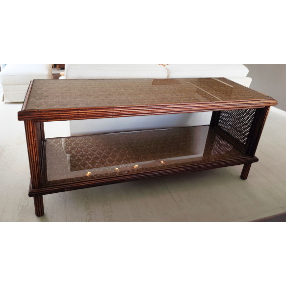 Aparador Armando Cerello, de bambu e vime, com tampo e prateleira em vidro - 180 x 65 x 78 cm alt - Estrutura de bambu natural com acabamento artesanal, laterais em trama geométrica e prateleira inferior com aplicação de vidro sobre trançado decorativo. Design atemporal, unindo leveza e robustez.