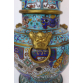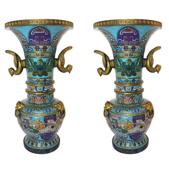 Par de rara ânfora Hàojio chinesa finamente lavrada em cloisonné e bronze dourado, ornada ao estilo das peças Iznik com profusa decoração policromada em desenhos de flores, garatujas, arabescos, dragões e barrados em gregas. Alças laterais nos formatos estilizados de pássaro, com detalhes em apliques de cariátides de cão de Fó no corpo. Na parte inferior das peças, o mesmo mote de decoração - 23 cm de diâmetro e 47 cm de altura, cada - China, circa 1900.