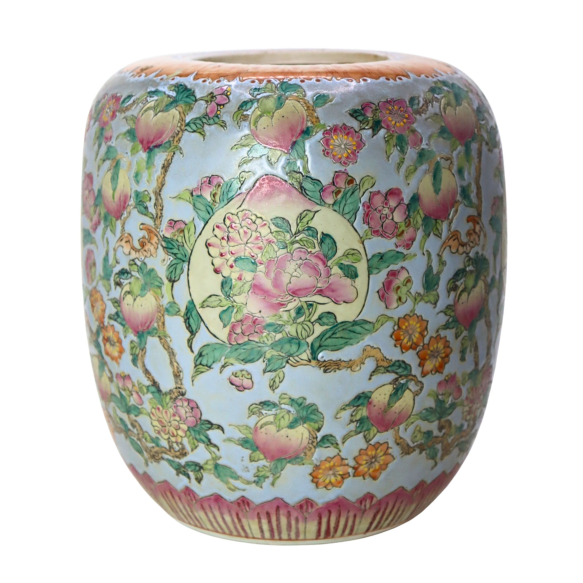 Vaso chinês globular em porcelana Família Rosa - China, final da Dinastia Qing / início da República (séc. XIX/XX) - 28 cm alt, ricamente decorado em esmaltes famille rose com ramos de pessegueiro florido e frutificado, símbolo de longevidade. Marca apócrifa “Da Qing Jiaqing Nian Zhi” na base. Sem tampa. Excelente estado.