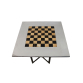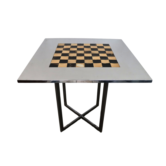 Giulio Coltellacci (Roma, Itália, 1916-1933) - Mesa para jogo de xadrez composta de tampo com tabuleiro confeccionado em chifre e estrutura de madeira, com pernas cruzadas em geometrismo, revestida por aço espelhado - 80 x 80 x 78 cm de altura - Itália, década de 1970.
