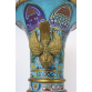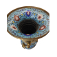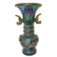 Par de rara ânfora Hàojio chinesa finamente lavrada em cloisonné e bronze dourado, ornada ao estilo das peças Iznik com profusa decoração policromada em desenhos de flores, garatujas, arabescos, dragões e barrados em gregas. Alças laterais nos formatos estilizados de pássaro, com detalhes em apliques de cariátides de cão de Fó no corpo. Na parte inferior das peças, o mesmo mote de decoração - 23 cm de diâmetro e 47 cm de altura, cada - China, circa 1900.