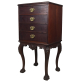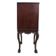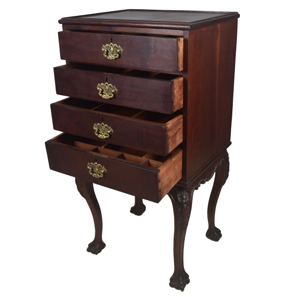 Móvel para faqueiro em madeira entalhada com 4 gavetas. Pernas com pés em garra. Puxadores em bronze. Discretas marcas de uso. Med. 1,23 x 62 x 51cm.