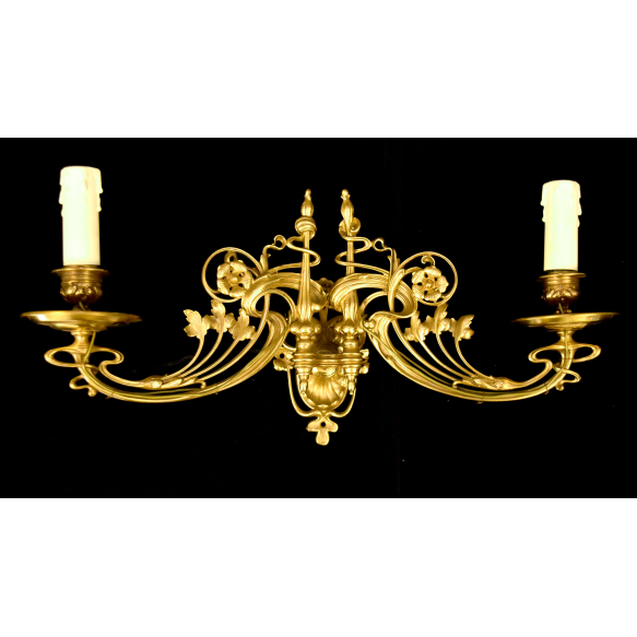Aplique em bronze de fundição francesa Art Nouveau (1890-1914). Originalmente para velas, adaptado para eletricidade, articulado. Complexa trama fitomorfa. Medidas: 22 x 46 x 13 cm.
