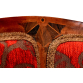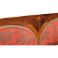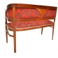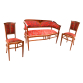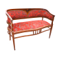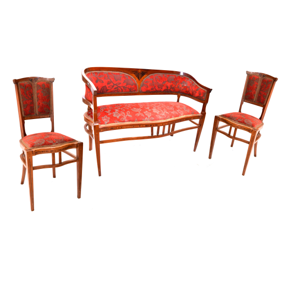 Conjunto de sala de estar, transição do estilo Art Nouveau para Art Déco, cerca de 1930. Madeira de peroba maciça, plaquetada em faixas, marchetaria no formato de morcego geometrizadobem ao centro. Consta de namoradeira com encosto curvilíneo nos flancos e duas cadeirinhas.Estofado aveludado e floral na cor bordeaux. Medidas: 82 x 115,5 x 53,5 cm. / 92 x 40,5 x 45,5 cm.