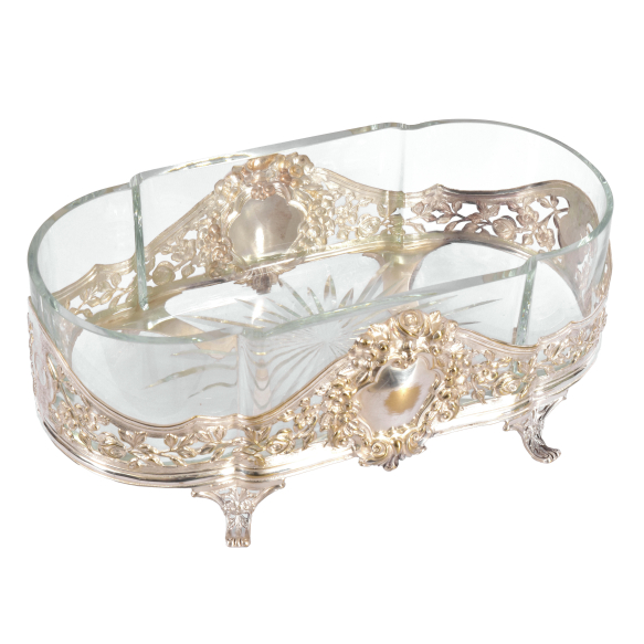 WMF Se você não assistiu esse video, assista. WMF - IKORA - 1927. CENTRO DE MESA COM RECIPIENTE EM CRISTAL ORIGINAL. Medidas: 11,7 x 31 x 18 cm. WMF (Württembergische Metallwarenfabrik)- Geislingen, Alemanha. IKORA foi uma linha de produção da WMF realizada em 1927 pelo seu NKA - Neue Kunstgewerbliche Abteilung (Nova Divisão de Artes Aplicadas) sob a direção de Hugo Debach, colecionador e apaixonado pela Arte Asiática. WMF realizou sob a marca Ikora Edelmetall uma ampla produção de peças em estilo geométrico inspiradas no Art Déco e na Arte Japonesa em latão e níquel decoradas à mão com esmalte aplicado por fusão na superfície do metal.