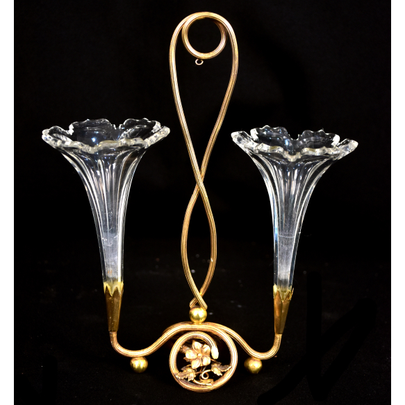 Floreiro Art-Nouveau. França, século XIX. Metal dourado de inspiração floral. Recipientes em cristal translúcido, com bordas lapidadas. Med. 23,5x19,5x8cm.