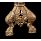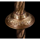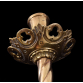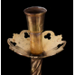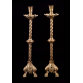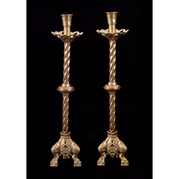 Par de antigos castiçais sacros em bronze polido, base triplóide figurando "criaturas aladas", em reverência e crucifixo ao centro entre volutas e vazados. Vazada também são as bobeches com "trifólios"(do latim trifolium, forma de trevo de três folhas) é uma forma gráfica composta do esquema de três anéis sobrepostos utilizados na arquitetura e no simbolismo cristão. O Fuste é retorcido. Marcas não constam. Cinzelado e bem lavrado. Medidas: 57 x 13 x 13 cm.