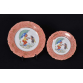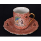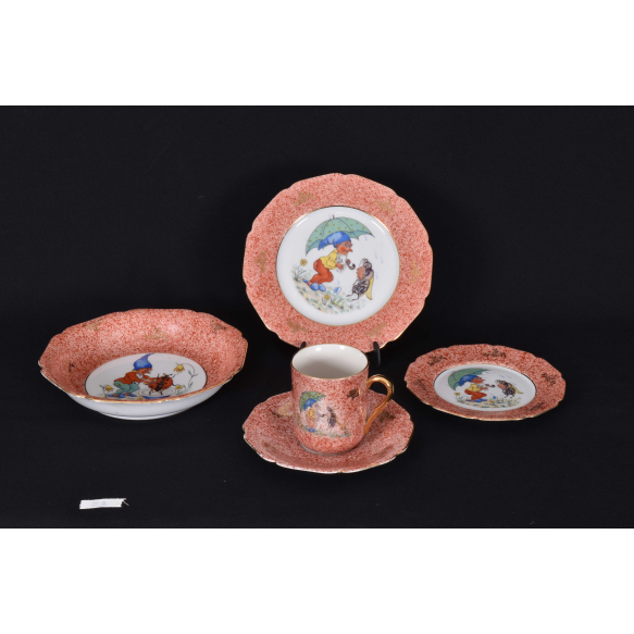 Serviço infantil em porcelana alemã marcada: BAVARIA -U.S. ZONE. ( Ocupação Americana: 1945-1949 )* Manufatura: Porzellanmalerei LENI PARBUS (1904 -1955).Policromia figurando duendes, pintura manual em esponjado na orla. Cor predominante: Coral. Consta de:1 xícara, 2 pires, 1 pratinho e 1 bowl. Maior diâmetro: 20 cm.