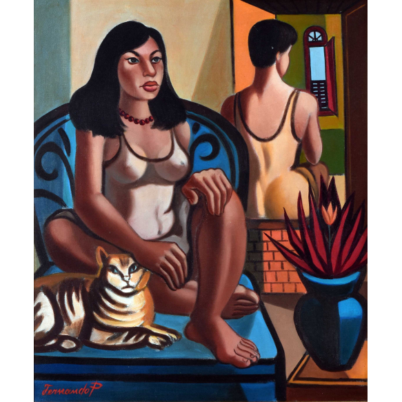 Fernando P. "Mulheres com Gato" Óleo sobre tela Medidas: 55 x 46 cm. Emoldurado: 75,5 x 66,5 cm.
