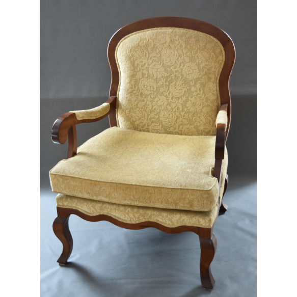 LOUIS- PHILIPE - Par de grandes poltronas de braço, estilo Francês, também conhecida como Louis XVI. Reforçada estrutura em madeira. Assento, apoios de braço, encosto e parte posterior revestidos em tecido adamascado, cor marfim. Pernas curvas. Medidas: 103x75x80 cm