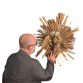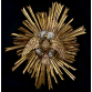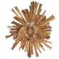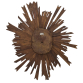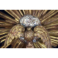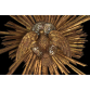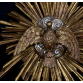 DIVINO ESPÍRITO SANTO. MINAS GERAIS, Sec. XIX. Talha em cedro carnada, dourada e policromada. Resplendor raiado, miolo em nimbos concêntricos em folhas de prata. A pomba é bem proporcionada, miudamente lavrada em camadas de penas, folhadas em ouro brunido. MEDIDAS: 78x74x18 cm. PESO TOTAL: 7 KG