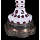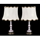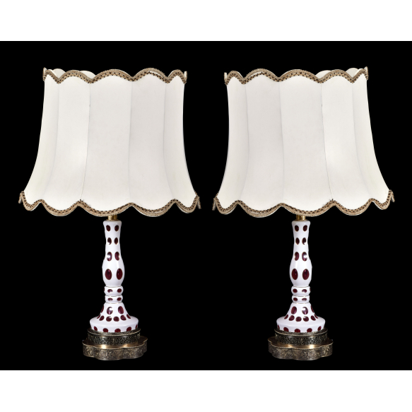 Par de abajours em overlay, na cor rubi e leitosa, decoradas com lapidações em olivas e bolas. Bases em metal, com trabalhos florais e vazados. Cúpulas em tecido. Metal com desgastes causados pelo tempo. Medidas totais: 80 x 49 x 49 cm. Medidas base: 50 x 19 x 19 cm.