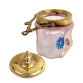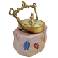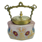 Biscoiteira Art Nouveau, Alemanha (1890-1910). Vidro fosco, moldado decorada com pintura de flores. Guarnições em metal dourado. Alça em bronze. Med. 14,5x11x8,5cm.