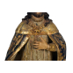 SAINT LOUIS- SÃO LUIS IX - REI DE FRANÇA. Imagem de fatura erudita, em madeira lavrada e policromada.Olhos de vidro, azuis, fitando o alto em expressão piedosa, boca entreaberta, dentes. Capa azul "Flor de Lis", ....sobrepeliz, (Tosão de Ouro) MEDIDAS: 36 X 16 X 13 CM