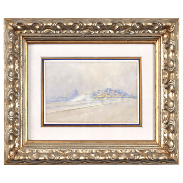 GOLDSCHMIDT, HENRIQUE (1867, Rio de Janeiro, RJ - 1952) Igreja da Glória e Pão de Açúcar, visto do antigo Passeio do Flamengo, anterior ao Aterro. Aquarela sobre papel. Ass. e situado Rio, cid MEDIDAS: 15 x 23cm. Na Moldura: 27 x 34,5cm.