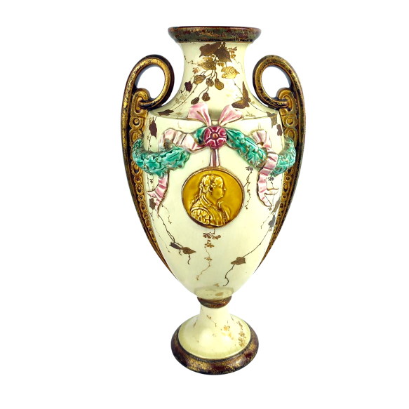 H. BOULENGER & Cie. - CHOISY-LE-ROI- FRANCE (1804-1938)- LOUIS XIV e MARIE THERESE D'AUSTRICHE. Vaso em faiança decorado com bustos dos monarcas em relevo. Pintura floral, laços de fita, borboletas e mariposas em dourado. Apresenta discreto bicado na borda e desgastes no dourado. MEDIDAS:38 X 19 X 9,5 CM