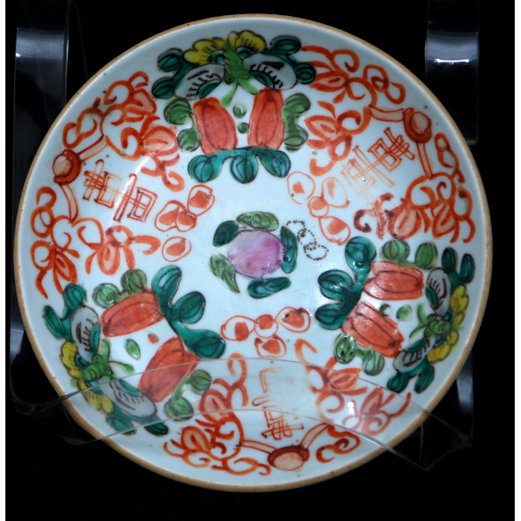 PORCELANA DINASTIA QING, CHINA PERÍODO DAOQUANG (1821-50). PRATO DE PÃO, Esmaltes Família Rosa. Figuração: Pêssego no centro, libélulas, frutos avermelhados, caligrafias. Marca em vermelho ao fundo: Nó sem fim. Diâmetro: 13 cm
