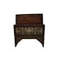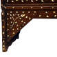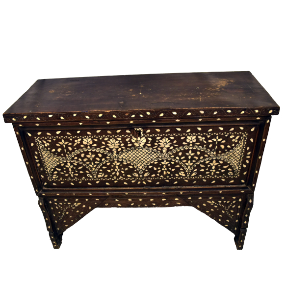 As laterais, os pés e o avental são ricamente adornados com o equilíbrio rítmico entre geometria e forma orgânica é uma marca registrada da arte do Oriente Médio, aperfeiçoada nas grandes oficinas de marchetaria de Damasco.