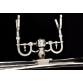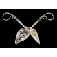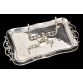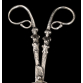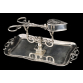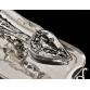Tesoura espevitadeira com berço e suporte. Metal prateado lavrado: efígies de caprinos nos braços e São Miguel Arcanjo, laureado por anjos e o anjo caído em alto relevo na tampa do abafador. Brasil, século XIX. BANHO DE PRATA REFEITO. Medidas berço: 9,5 x 26,5 x 14 cm. Medidas espevitadeira: 3,5 x 19 x 10 cm. Medidas totais: 12,5 x 26,5 x 14 cm.