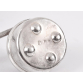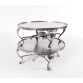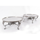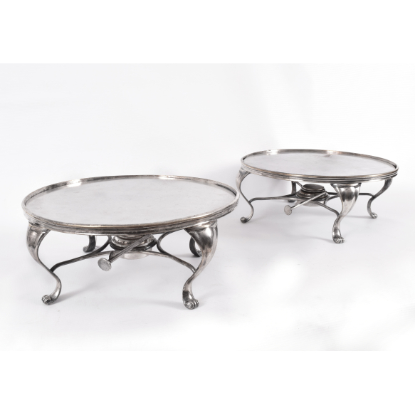 ARGENTARIA PERUANA S.A - Par de rechauds redondo de metal com banho de prata. 4 pés, com amarração sustentando a trempe. Prato em duro aluminio, liso. Altura 12 cm e diâmetro 29 cm. Com desgastes.